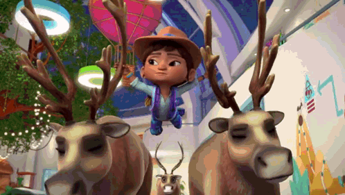 a boy in a cowboy hat is riding a reindeer while holding an umbrella .
