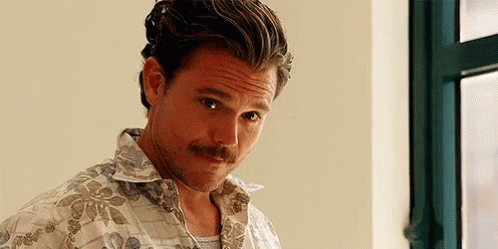 Timothy Olyphant, wearing a floral shirt, gives a thoughtful look to the camera.