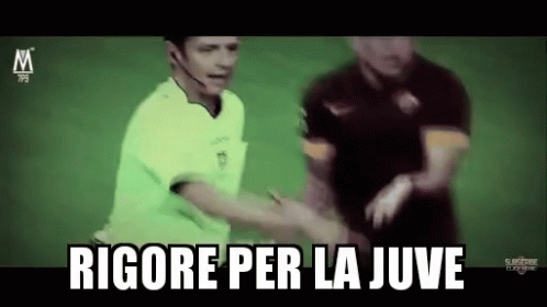 A football referee points to the penalty spot, with the caption 'Penalty for Juve' displayed, referencing a controversial call.