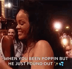 Rihanna smiles charmingly, reacting to someone just realizing her 'poppin' status, as text overlay suggests.