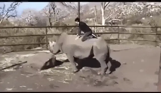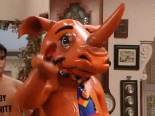 Riigz Rhino mascot, also known as Rigby, wearing a colorful tie, looks around an indoor setting.