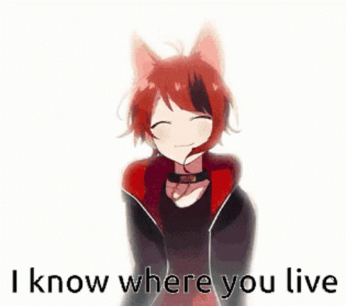 Anime character Riinu Rinu smiling with the text 'I know where you live' in a meme format.