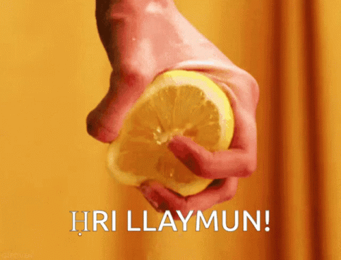 A hand vigorously squeezing a lemon, with the Amazigh phrase 'ḤRI LLAYMUN!' (Squeeze the Lemon!) displayed.