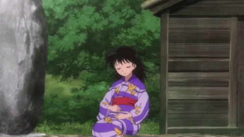 Rin from Hanyo No Yashahime, associated with Sesshomaru, sits peacefully in a purple kimono, eyes closed, by a wooden building.