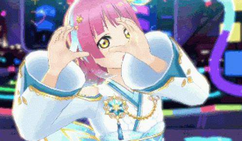 Rina Tennoji from Love Live! Nijigasaki High School Idol Club winks and makes a heart shape with her hands.