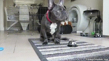 A French Bulldog learns to ring a bell for attention or treats, showcasing its intelligence and training.