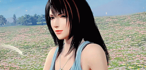 Rinoa from Final Fantasy VIII stands gracefully in a vibrant field of flowers.