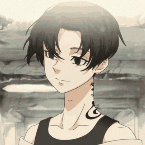 An anime character with black hair and a neck tattoo, smirking with a calm expression.