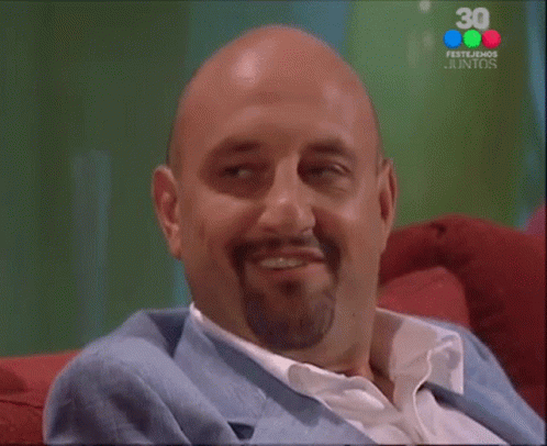 Gabriel Goity from Los Roldan laughing and smiling on a red couch, celebrating with Telefe.