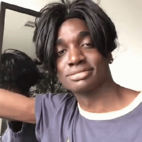 A man in a wig makes funny faces and laughs out loud, showing expressive humor.