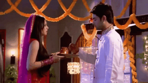 Drashti Dhami and Rishabh performing a traditional ritual, with Rishabh pouring liquid for Drashti to drink.