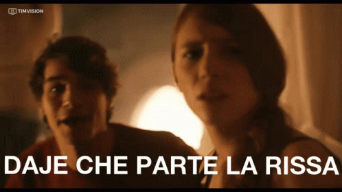 Eva and Federico from Skam Italia, with the text 'DAJE CHE PARTE LA RISSA' (Come on, the brawl is starting) overlaid.