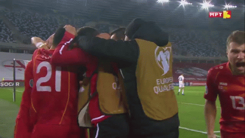 Makedonija's Ristovski, wearing jersey number 13, celebrates emotionally during a football match.