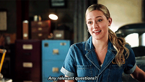 Lili Reinhart as Betty Cooper asks 'Any relevant questions?' in a scene from Riverdale, wearing a denim uniform.
