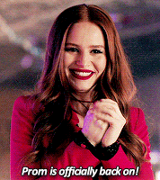 Madelaine Petsch as Cheryl Blossom excitedly announces that prom is officially back on in Riverdale.