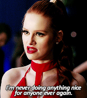 Cheryl Blossom from Riverdale, played by Madelaine Petsch, declares she's never doing anything nice for anyone ever again.