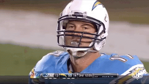 Philip Rivers, quarterback for the Chargers, looks serious on the field during an NFL game.
