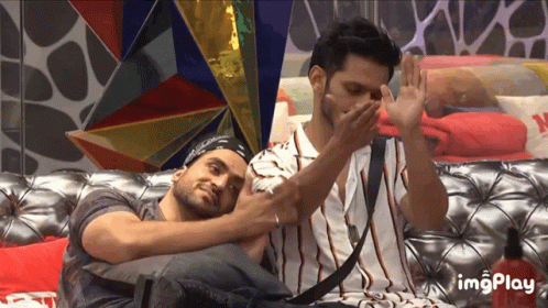 Rahul Vaidya and Aly Goni share a tender moment on the couch during Bigg Boss, showcasing their close bond.