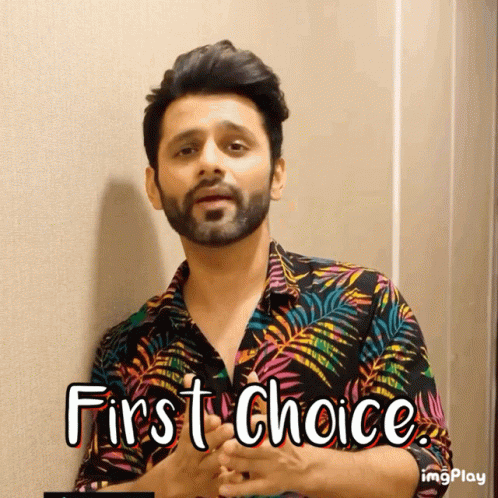 Rahul Vaidya, wearing a colorful shirt, points and clearly says 'First Choice' to the camera.