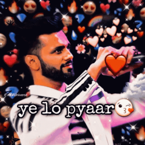 Rahul Vaidya holds a heart with 'ye lo pyaar' message, surrounded by sparkling heart emojis.