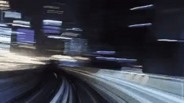 Experience the blur of a high-speed train rushing through a modern city at night.