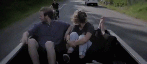 A group of friends enjoying a road trip, sitting in the back of a moving truck, cruising on the open road.