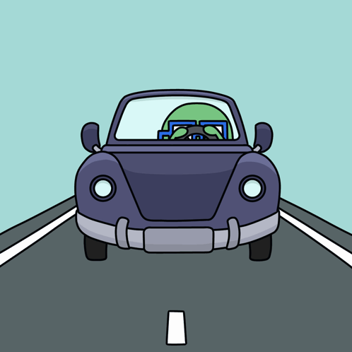 A cartoon character, Lil Beans, drives a blue car down a highway, reflecting on being jobless.