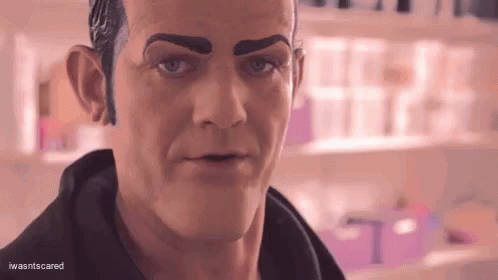 Robbie Rotten, played by Stefan Karl, in a memorable close-up, showing his iconic character look.
