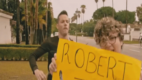 Robert Mendoza superfan walks with a purple guitar and a yellow sign, yelling on a sunny street.