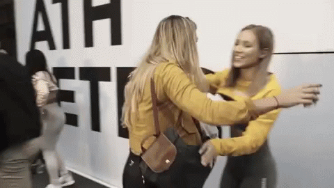Robin Gallant shares a warm hug with a friend at a Gym Shark meet and greet event.
