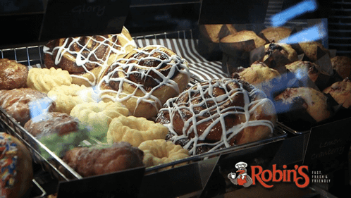 A tempting display of fresh baked goods, including cinnamon rolls, muffins, and pastries, at Robin's Donuts.