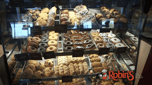 A vibrant display of various donuts, pastries, and baked goods at Robin's Donuts.