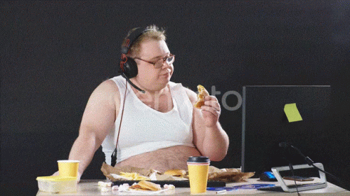 Steven Mc Knight, a Roblox Star Wars gamer, eats a sandwich and fast food while wearing a headset at his computer.