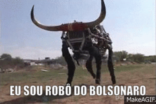 A large robotic bull, identified as 'Bolsonaro's Robot', stands in a field with the text 'EU SOU ROBÔ DO BOLSONARO'.