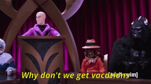 Robot Chicken's Scarecrow asks, 'Why don't we get vacations?' during a panel discussion with other characters.