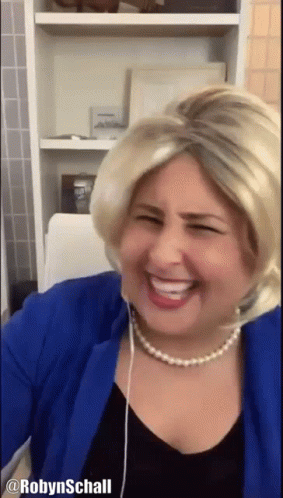 Robyn Schall laughing hysterically while wearing a blonde wig and pearl necklace, with her name visible.