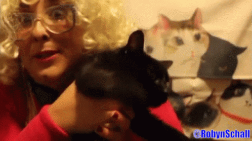 Robyn Schall, wearing a blonde wig and glasses, holds a black cat while smiling at the camera.