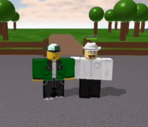Roblox characters Rochas313 and Cappy0 greet each other in a park setting, with Cappy0 saying "hello!".
