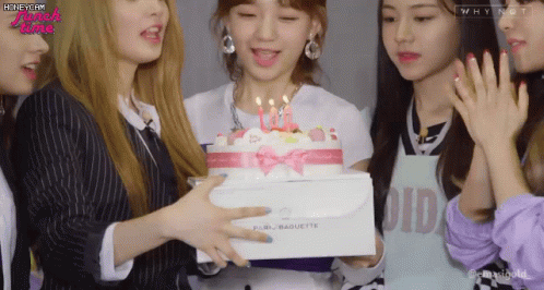 Rocket Punch members Dahyun, Juri, Yunkyoung, Suyun, Sohee, and Yeonhee celebrate, blowing out candles on a cake.