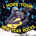 An animated gorilla enthusiastically playing an electric guitar, rocking out with passion.
