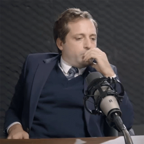 Gregorio Duvivier, from Porta Dos Fundos, appears worried and bites his nails while sitting in front of a microphone.