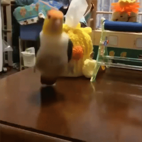 Rojo the parrot hops playfully on a wooden table next to a cute yellow tissue box holder.