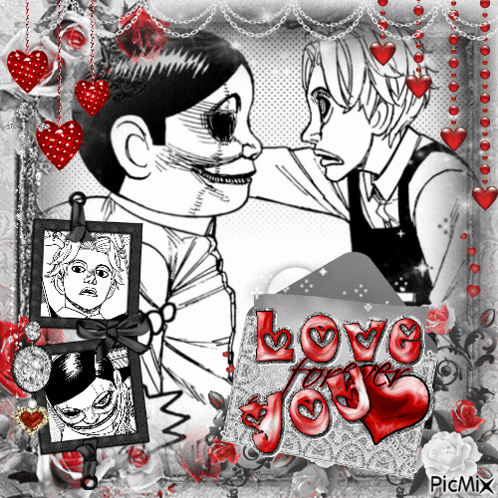 Rokuro Serpo and Okarun from Dandadan in a romantic black and white fan art collage with 'Love You' text.