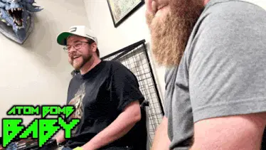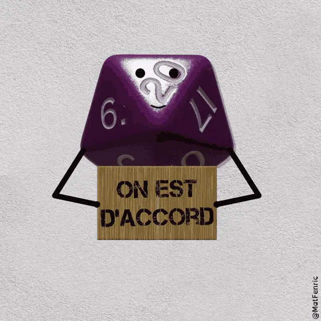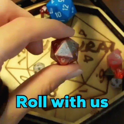 A hand rolls a D20 dice in a dice tray with 'Roll with us' text, featuring other dice.