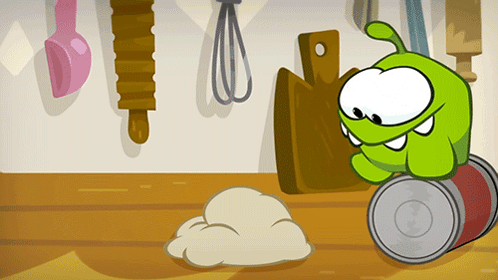 Om Nom from Cut the Rope enthusiastically rolls out dough with a can.
