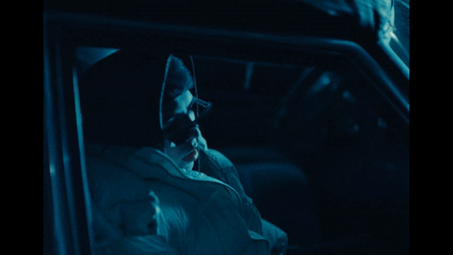 Person in sunglasses and scarf in car, listening to Peso Pluma & Oscar Maydon's 'Rompe La Dompe'.