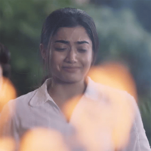 Rashmika Mandanna in a white shirt, crying with her eyes closed, with a soft glow in the background.