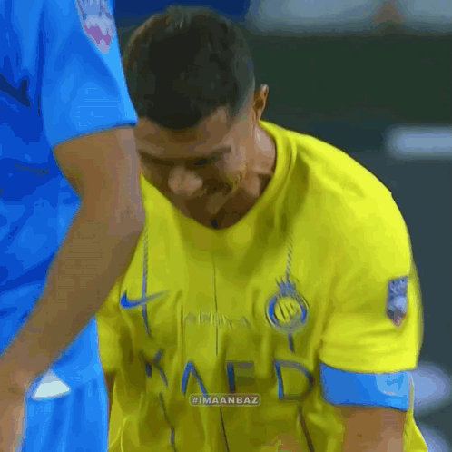 Cristiano Ronaldo's intense reaction while playing for Al Nassr in his yellow kit.