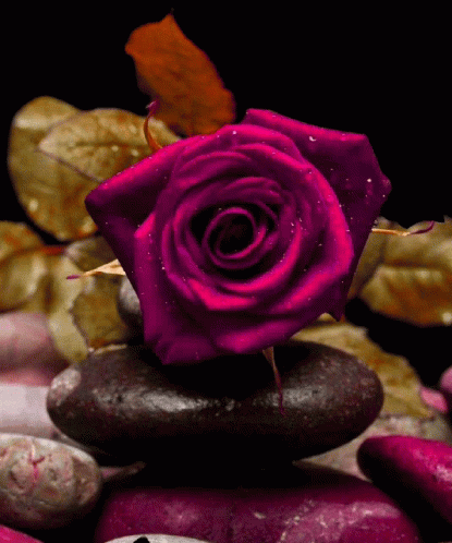 A vibrant red rose with water droplets transforms into a rich purple, resting gracefully on stacked dark rocks.