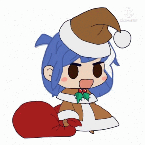 a cartoon of a girl wearing a santa hat and holding a bag of presents